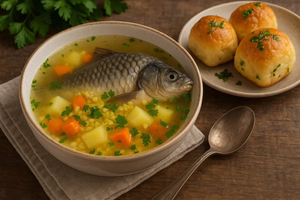 Шацькі озера — то окрема історія. І короп звідти — теж. Юшка (або рибний суп, якщо простіше) готується з свіжовиловленого коропа, з додаванням кореневих овочів, пшона, зелені. Ключовий момент — варити треба на дуже малому вогні, щоб бульйон був прозорим.